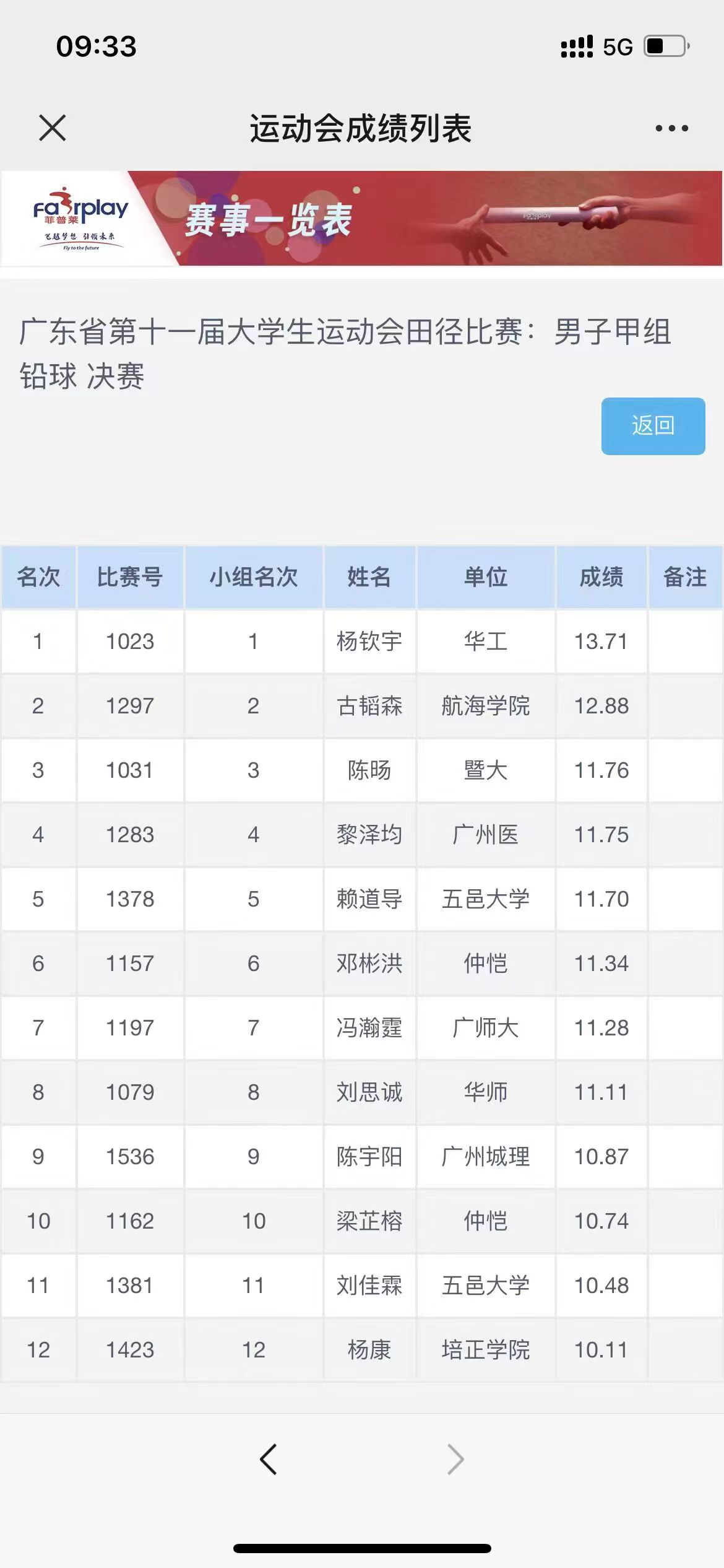 (公共体育教学部供稿)第十一届广东省大学生运动会田径比赛于6月18日在华南理工大学(五山校区)运动场火热开赛。在6月22日上午举行的男子铅球比赛中,m88 app运动员—信通学院20级软件工程专业古韬森同学,以12.88米的个人最好成绩,荣获大运会男子铅球第二名。