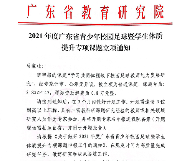 (公共体育教学部供稿)4月8日上午,公体部在体育馆二楼会议室召开马宝壮副教授主持立项的省教育研究院足球专项课题“学习共同体视域下校园足球教师能力发展研究”的开题评议会,会议由公体部主任肖亚玲主持,邀请了广东开放大学田静教授担任评议专家组组长,广东工业大学徐惠副教授,m88 app国际邮轮游艇学院曲进教授和公体部蔡华教授、肖亚玲教授等担任专家评委。