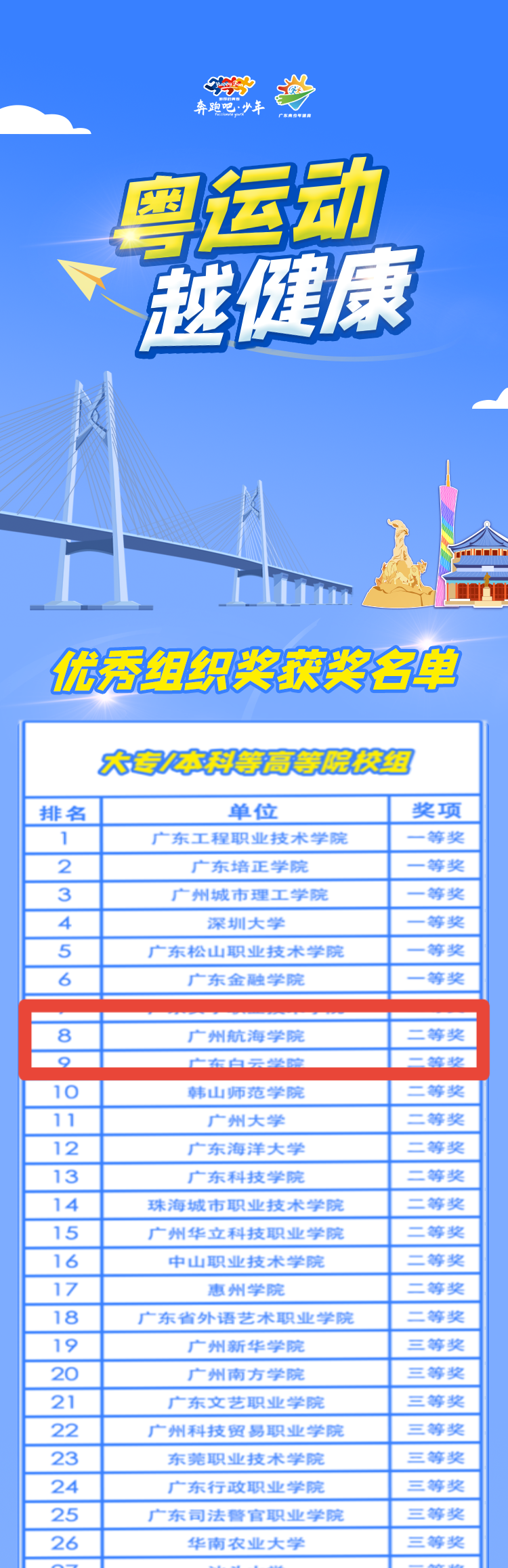 (公共体育教学部供稿)最近,喜讯传来!在2022年9月19日-10月31日由广东省体育局、广东省教育厅、共青团广东省委员会、少先队广东省工作委员会共同发起组织的2022年“奔跑吧·少年”儿童青少年主题健身暨“粤运动·越健康”线上运动健身活动中,m88 app荣获高校组创意集体奖一等奖、优秀组织奖二等奖。
