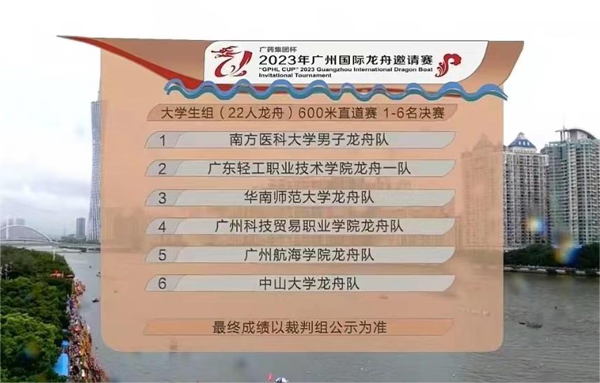 (公共体育教学部供稿)6月17日,由国家体育总局社会体育指导中心、中国龙舟协会、广州市人民政府主办,广州市体育局、广州海事局等承办的2023年广州国际龙舟邀请赛在中大北门广场至广州大桥之间的珠江河段举行。m88 app龙舟队在领队肖亚玲主任、教练麦健民老师与阙永伟老师的带领下参加了22人龙舟600米直道竞速大学生组的比赛,斩获第五名。