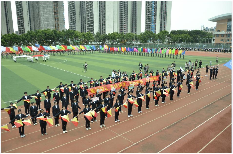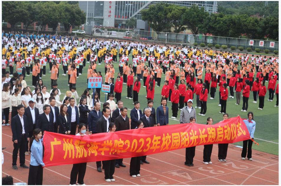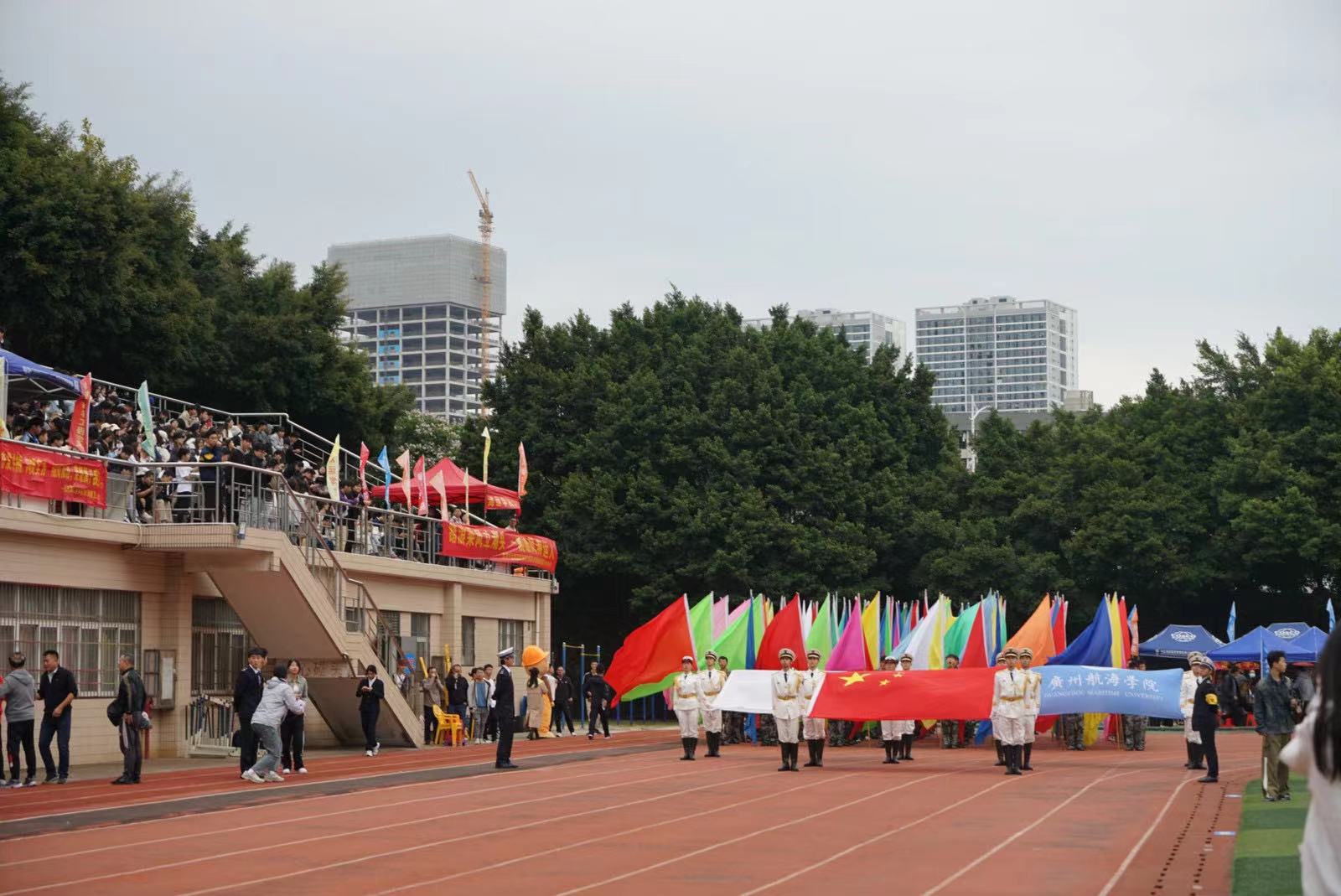 开幕式上国旗、校旗、会旗方队庄严入场后,洋溢着朝气和活力的各学院方队依次入场,大展风采。他们青春靓丽的衣饰装扮、独具风格的表演、憨态可掬的卡通人物、创意十足的队列变化,充分凸显了广航学子拼搏奋进的精神风貌和各学院文化特色。随后进行的《第九套广播体操》千人表演赛,动作整齐标准,场面壮观。
