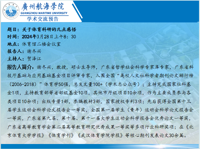 学术讲座预告:谢冬兴《关于体育科研的几点感悟》