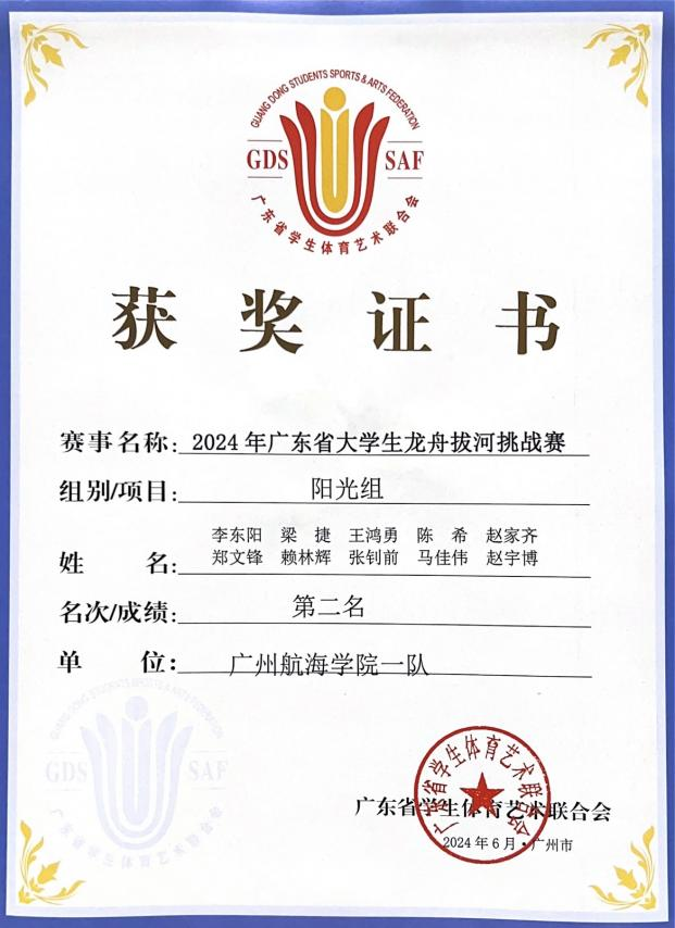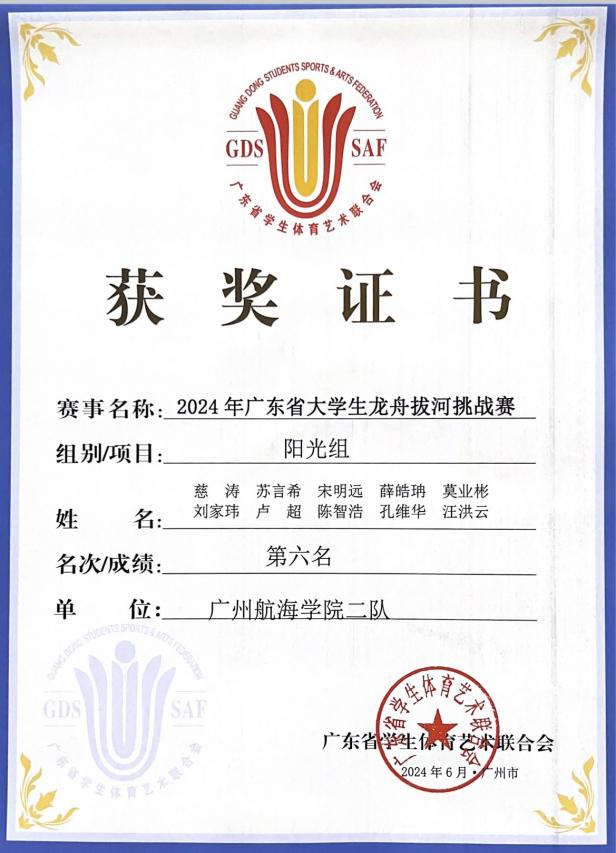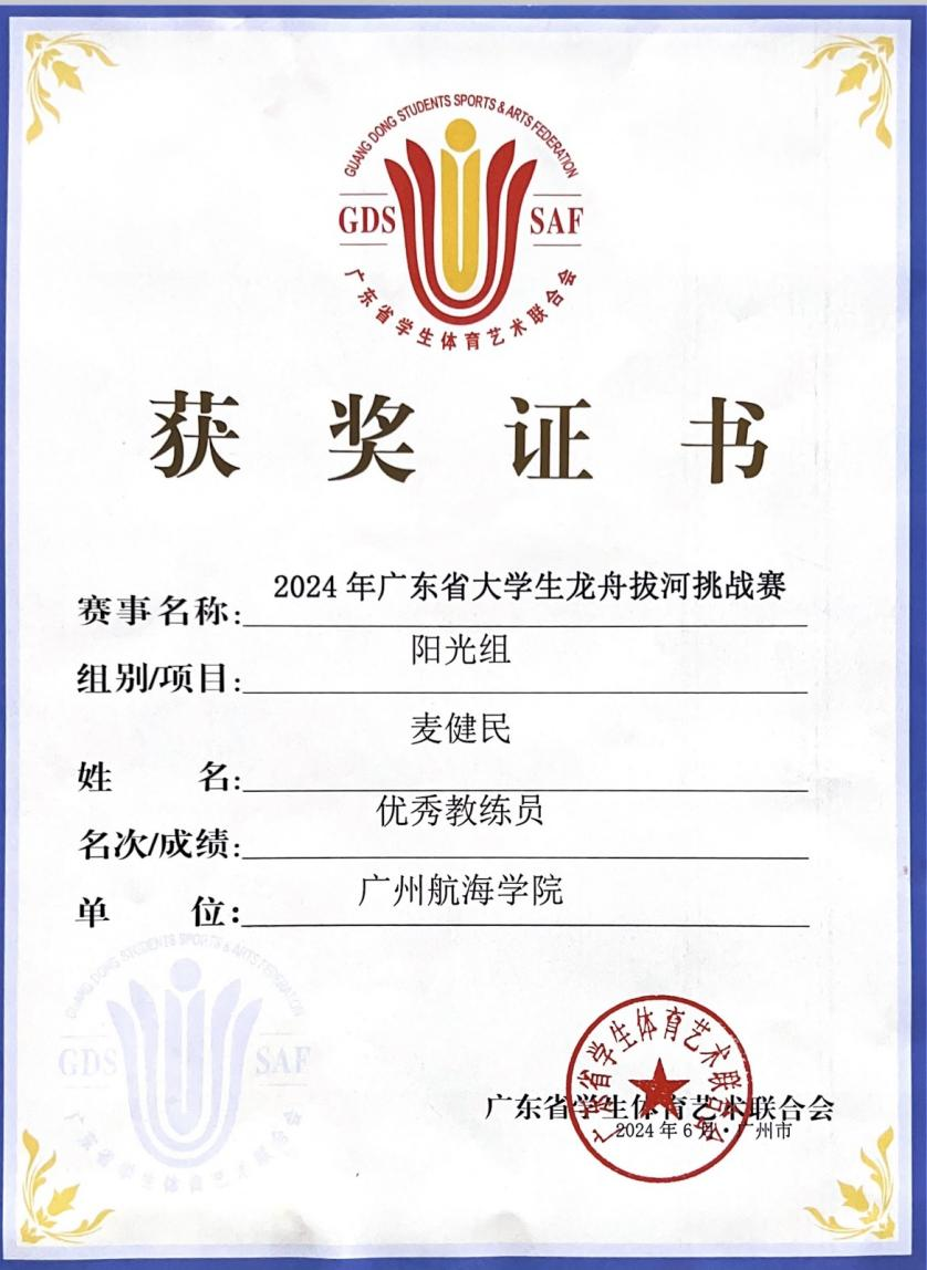 (公共体育教学部、校团委供稿)6月1日上午,由广东省学生体育艺术联合会主办、广州市黄埔游艇码头文化旅游有限公司承办的2024年广东省大学生龙舟拔河挑战赛在长洲岛海宇龙狮龙舟文化园举行。m88 app学生龙舟队在领队张立新、教练麦健民的带领下派出两支队伍参加了本次赛事,经过八轮的激烈角逐,最终m88 app龙舟队一队获得了阳光组第二名,m88 app龙舟队二队获得了阳光组第六名,教练麦健民被组委会评为优秀教练员。