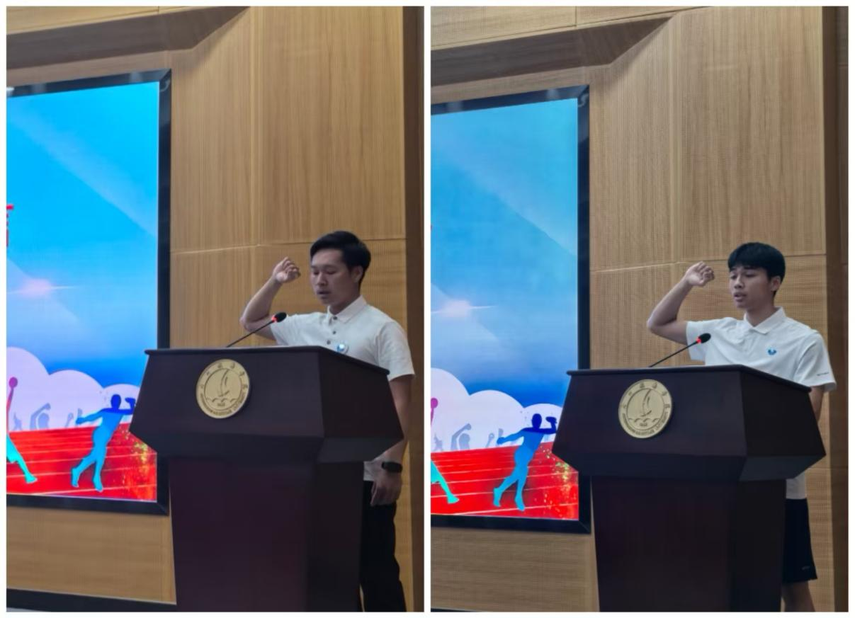 男子足球队教练刘思润代表教练员发言,他表示,教练员们将积极履行科学训练模式,打造一支敢战能胜、勇争一流的队伍,力争载誉而归。他代表全体教练员庄严宣誓:以高度的责任感与使命感,恪守体育精神,履行教练职责,带领运动员为学校荣誉而奋斗!